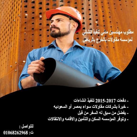 مطلوب مهندسين مدني تنفيذ انشائي لمؤسسه مقاولات بالخرج بالرياضمهندسين مدني- دفعات…